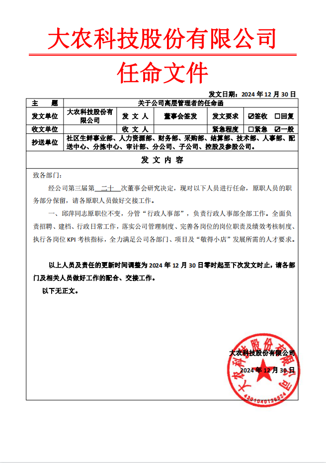 关于公司高层邱萍同志的任命函